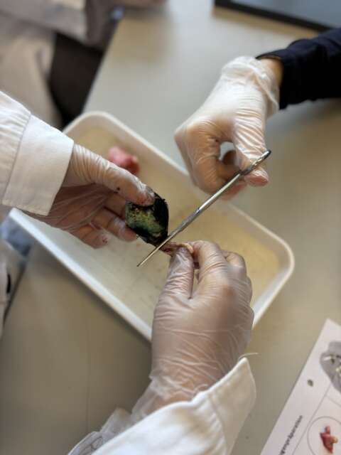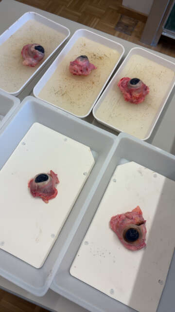 Im März haben die 6. Klassen im Biologieunterricht Rinderaugen seziert, um den Aufbau und die Funktion des Auges besser zu verstehen. Zu Beginn hat unsere Lehrerin das Auge vorsichtig aufgeschnitten. Danach haben wir es selbst weiter geöffnet.